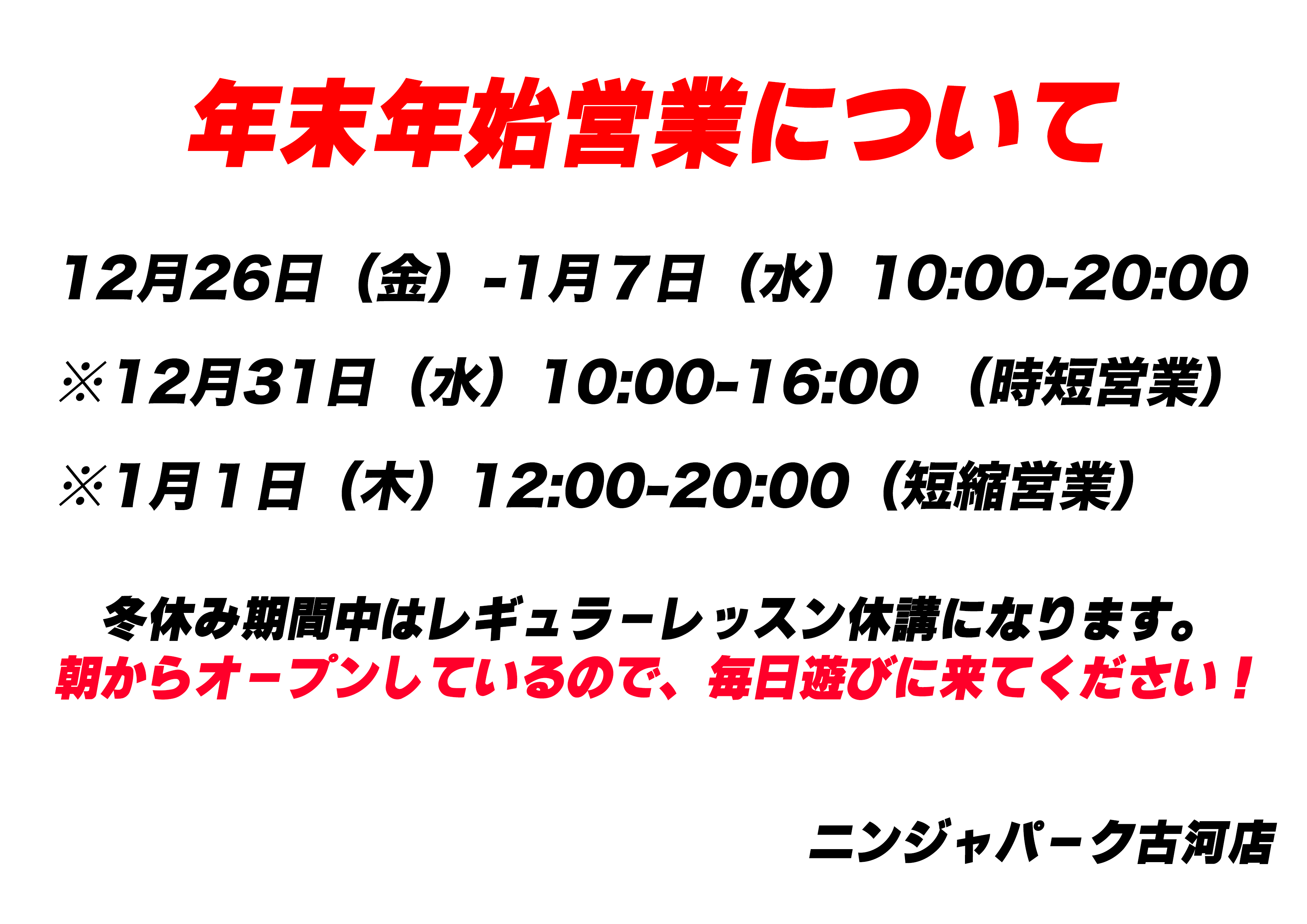 レギュラーレッスンは12月26日(金)冬休みに入るため休講