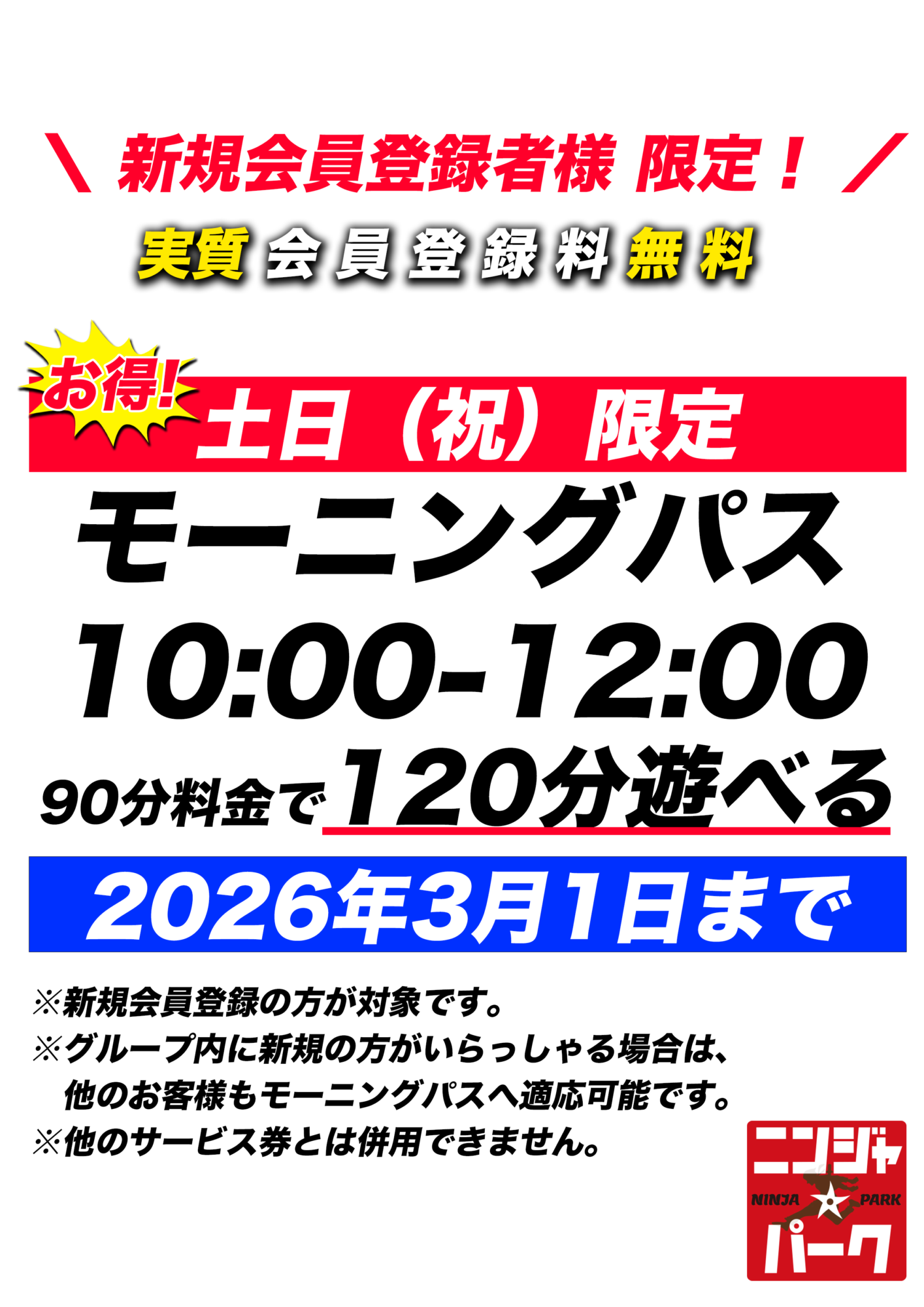 土日祝日の10:00〜12:00までにご来場の新規会員登録で