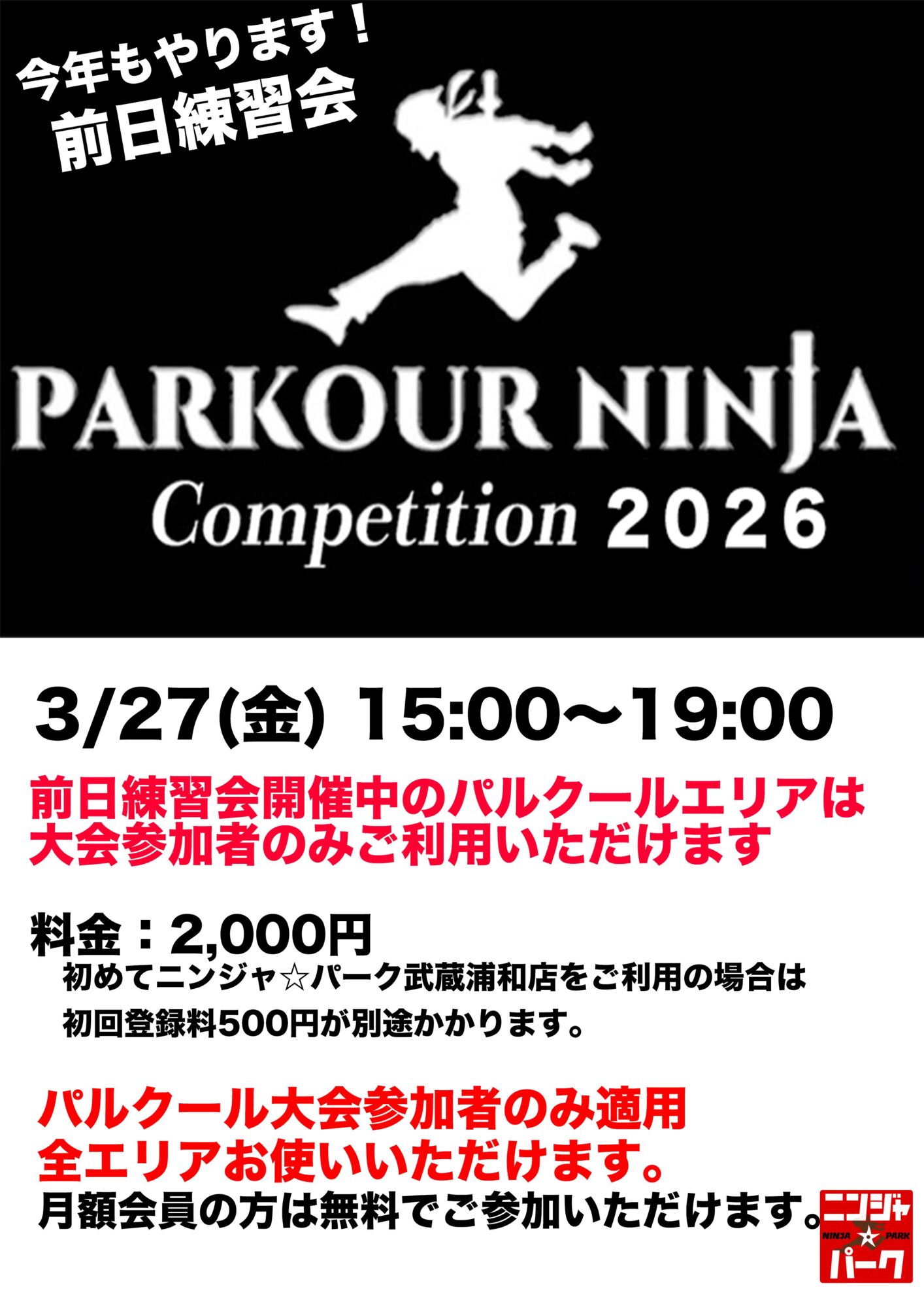 また、練習会開催中のパルクールエリアは練習会参加者およびその保護者様のみの入場となりますのでこちらもあらかじめご了承ください。