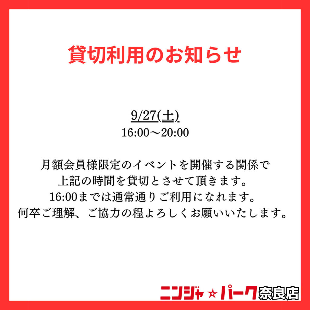 いつもニンジャパーク奈良店をご利用頂き誠にありがとうございます。