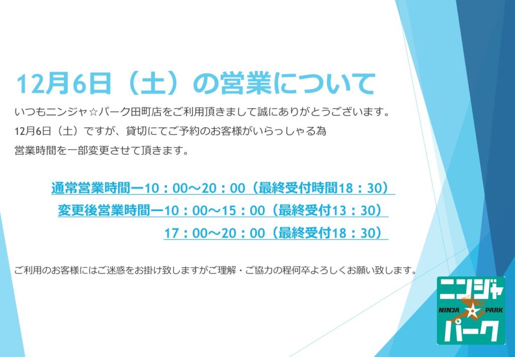 画像の通り、12月6日(土)に貸切にてご利用のお客様がいらっしゃるため